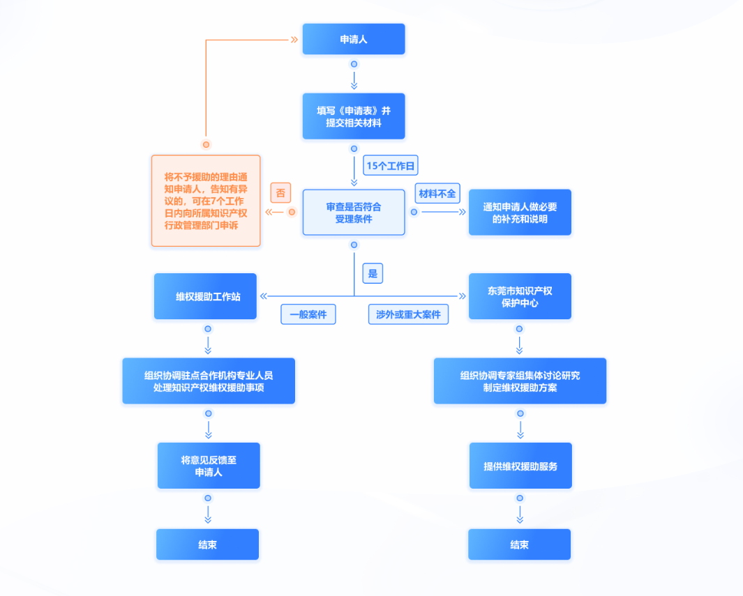 完成提交后,东莞市知识产权保护中心或知识产权维权援助机构将在5个工作日内审查材料是否符合受理条件,15个工作日内自行处理或组织、协调专家库专家处理知识产权维权援助事项,并将意见反馈至申请人。
