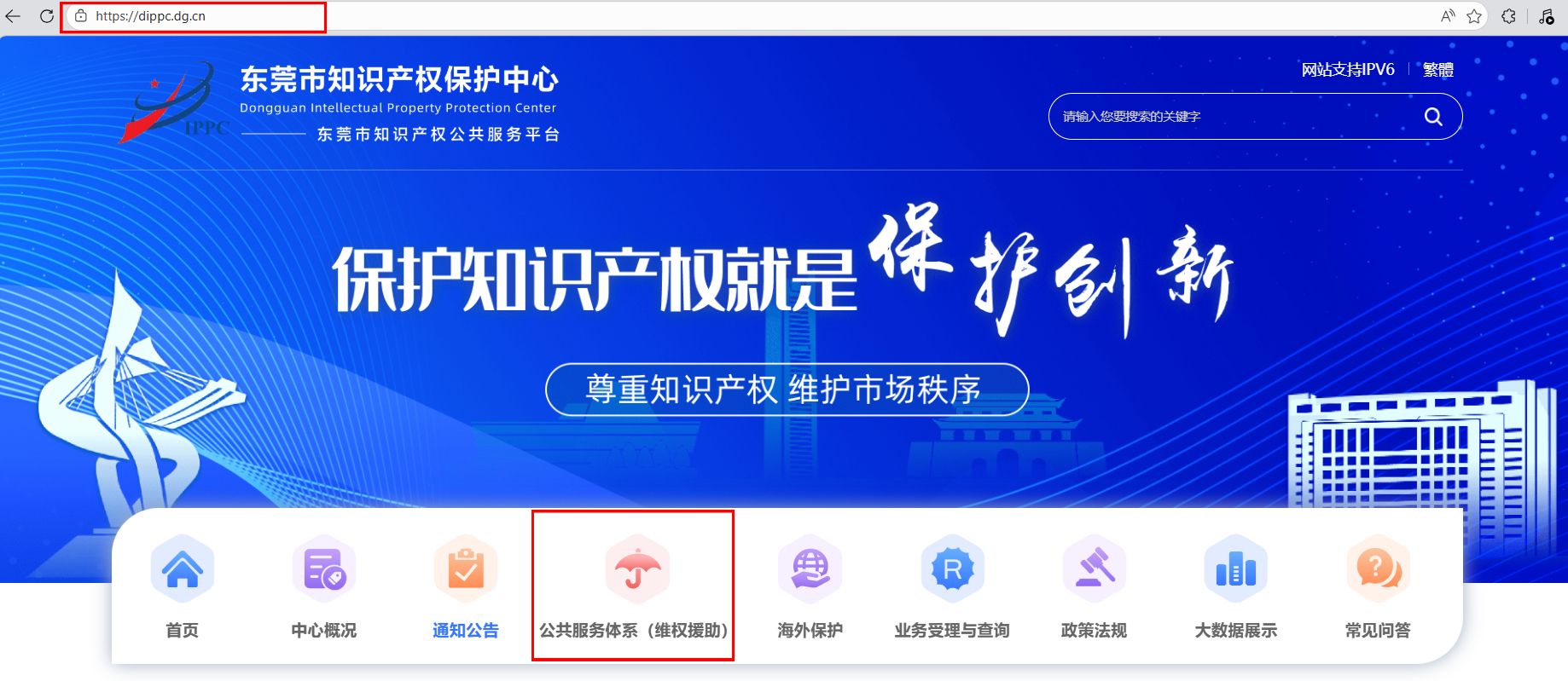 第一步:电脑端输入网址“http://dippc.dg.cn/”,进入“东莞市知识产权公共服务平台”,在首页点击“公共服务体系(维权援助)”。